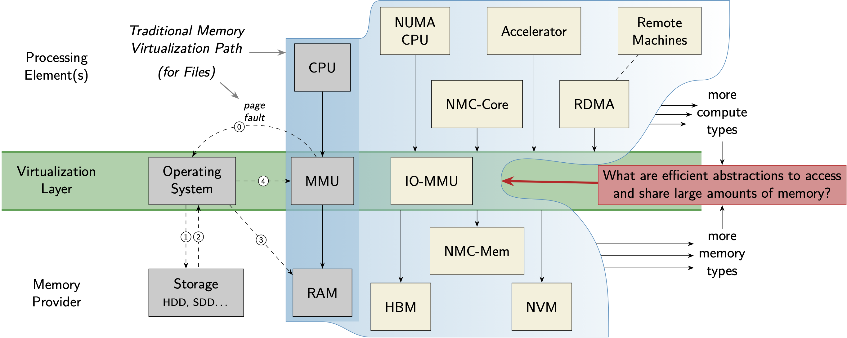 The management of memory resources has always been a core task of the operating system. However, OS designers are now facing disruptive changes on the memory side: New memory types, such as high-bandwith memory (HBM) or non-volatile memory (NVM) have arrived and more types of processing elements, such as RDMA-capable NICs, GPGPUs, or FPGA-based accellerators, access virtual memory directly via the IO-MMU. These heterogenious memory systems (HMSs) put not only the suitability of the classical memory hierarchy and memory access patterns at question, but also challenge the way memory is managed inside the kernel.